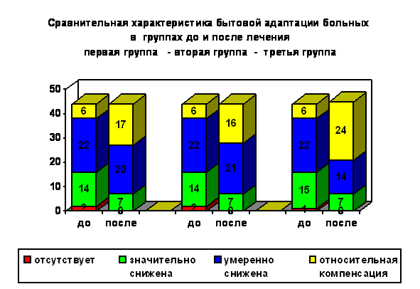 В таблице 6. представлены сравнительные данные бытовой адаптации больных в группах до и после лечения.