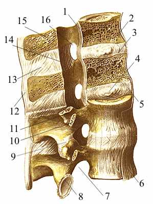 Рис. 7. Позвонки и их соединения. Вид сбоку (позвоночный