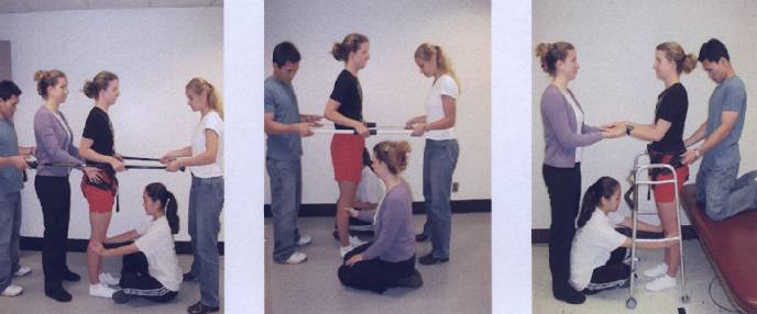 Инструкторы, используя шесты, двигаются согласованно с пациентом, чтобы обеспечить