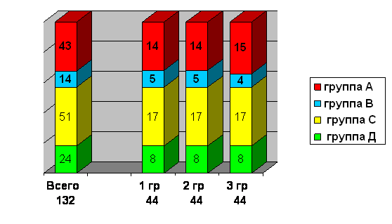 Для наблюдения и анализа все больные были разделены на три равные по количеству участников группы, в каждую из которых входили инвалиды категории «А», «В», «С», «D», сопоставимые по клиническим проявлениям и степени их выраженности.