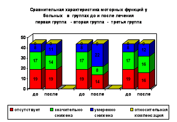 В первой и третьей группах произошли качественные изменения у больных, имевших умеренные двигательные расстройства. Кроме того, в третьей группе отмечены позитивные изменения у больных с нижней параплегией, по-видимому, за счет улучшения сенсорной афферентации.