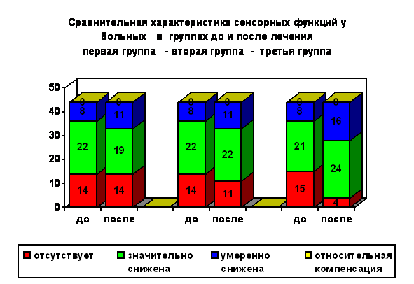 В таблице 4. представлены сравнительные изменения в сенсорной сфере в группах до и после лечения.