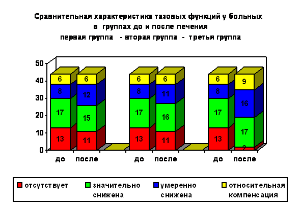 В первой и второй группах базисным лечением удалось нормализовать устойчивый пассаж мочи, добиться положительной динамики лабораторных показателей мочи. В третьей группе инвалидов отмечены значительные изменения со стороны тазовых органов. Так у 7 больных, относящихся к категориям «А» и «В» появился не постоянный (дневной) эквивалент позыва к мочеиспусканию, у 5 инвалидов сформировался устойчивый пузырный автоматизм, улучшились резервуарная и эвакуаторная функции мочевого пузыря, нормализовался устойчивый пассаж мочи, отмечена положительная динамика лабораторных данных у всех больных.