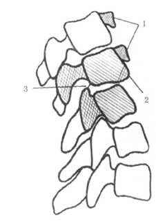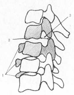края тела вывихнутого позвонка (2), а поперечные отростки нижележащих позвонков